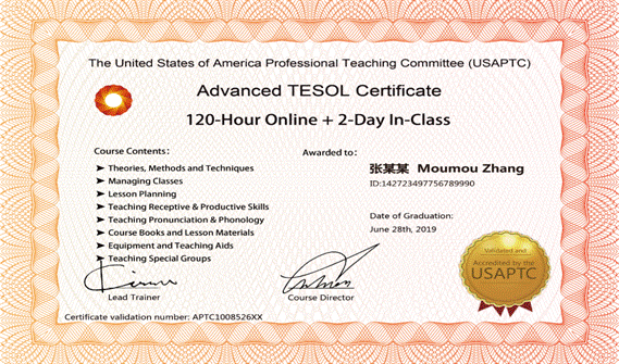 (2.)按时报名参加线上20个单元基础课程(120小时)、线下12小时外教专家提升课程(由TESOL资深培训师、美国专业教学委员会执行副主任SAM博士执教),并通过线下考试,取得TESOL国际英语教师高级资格证书,样本如下: