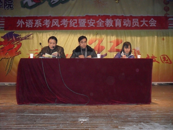 随着期末考试和寒假的临近,为进一步加强学风建设,严明考试纪律和提高员工的冬季安全防范意识,2010年1月10晚,外语系在东校区大礼堂召开了考风考纪暨安全教育动员大会,系党总支书记李岩、辅导员周静老师以及全体在校员工参加了动员大会,会议由系学工办主任任森龙主持。