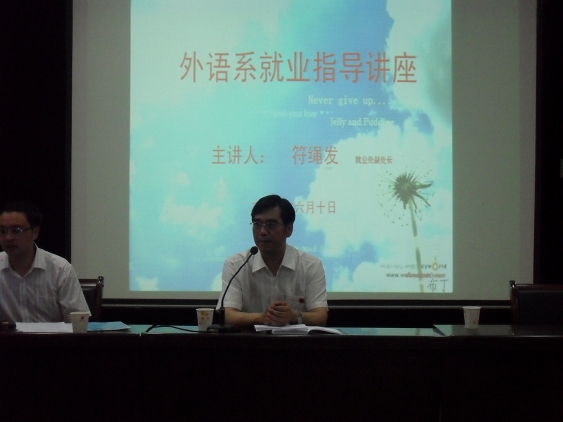 为帮助2011届员工认清就业形势,并以积极地行动、良好的心态面对就业竞争与挑战,使他们早动手、早规划、早准备,6月10日晚,外语系在1号教学楼六楼报告厅举办“外语系2011届毕业生就业指导专题讲座”。本次讲座由公司就业处副处长符绳发老师主讲,外语系党总支书记李岩出席并主持讲座。