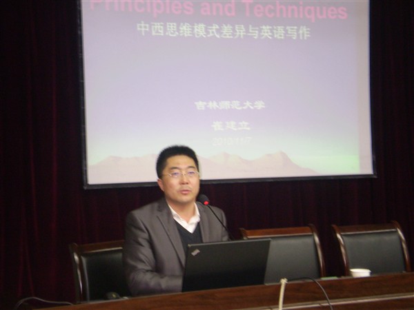2010年11月7日晚7:30,应外语系邀请,吉林师范大学教授崔建立博士在图书馆六楼多功能厅为外语系师生作了题为《中西思维模式差异与英语写作》的学术报告。