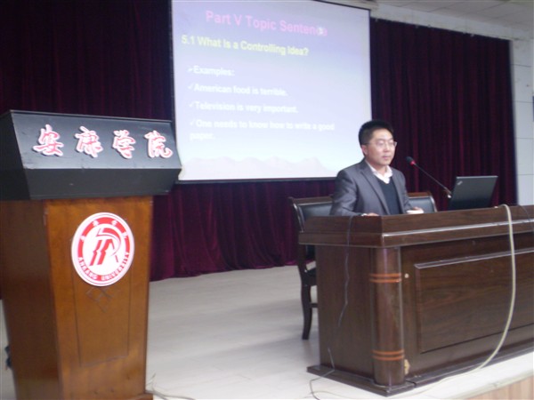 崔建立教授毕业于吉林师范大学,先后获得吉林大学英语语言学硕士学位和东北师范大学英语语言学博士学位。崔教授的学术背景和他多年的教学经历,使他在英语语言学研究领域有独到见解和学术建树,他从中西思维模式谈起,深刻剖析中西两种语言所蕴含的思维模式差异及其对英语写作的影响,与此同时,崔教授还就如何写好主题句、段落等做了深入分析,并提出了“开、承、扩、合”的写作方法,让在场的师生获益匪浅。崔教授风趣幽默,充满激情,长达两个多小的报告,赢得了全场师生阵阵热烈的掌声,在师生互动时,他耐心细致地回答同学们提出的问题,他谦虚的学者风范和富有见地的回答,赢得了师生们的热烈欢迎和好评。