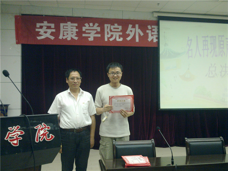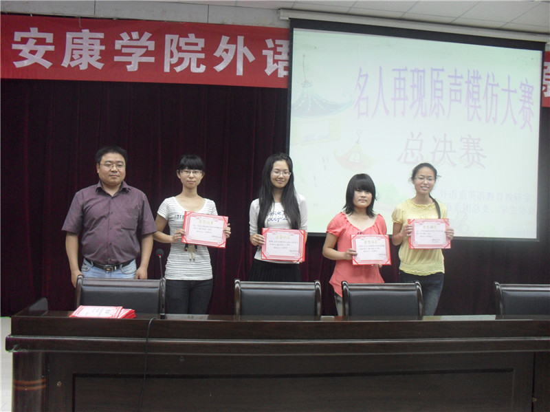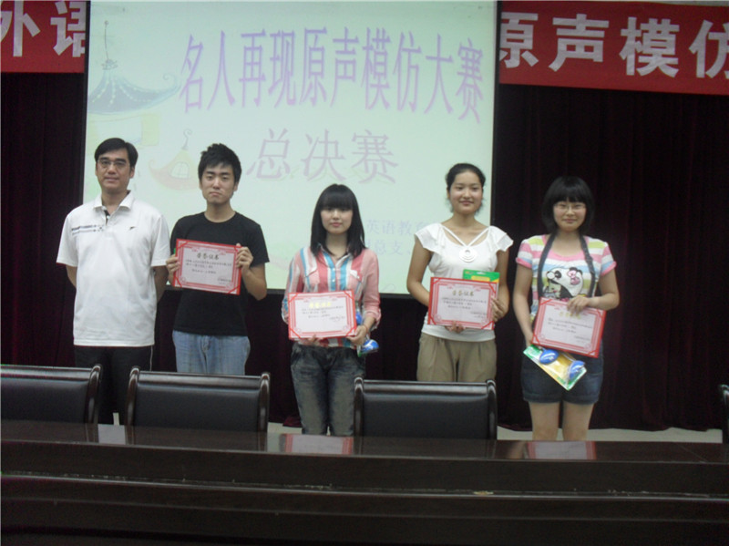 2011年6月1日晚7:30分,由外语系主办,英语教育教研室,外语系员工分会承办的外语系经典外文电影原声模仿大赛决赛在公司图书馆六楼多功能厅圆满落下帷幕。西安理工大学外国语言学资深教授、硕士研究生导师杨真洪教授、外语系领导应邀观看了比赛。经过层层筛选,外语系09级英语教育许保华等六个参赛组分别获得了一、二、三等奖。