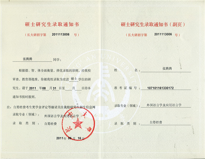 我系同学考研再传佳绩:英语专业2007级张腾腾同学考取长安大学“外国语言学及应用语言学专业”硕士研究生。