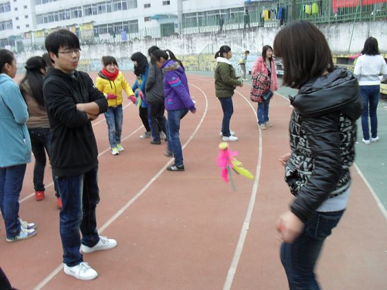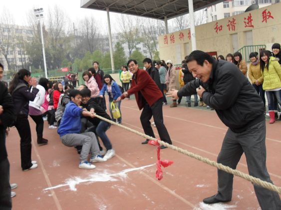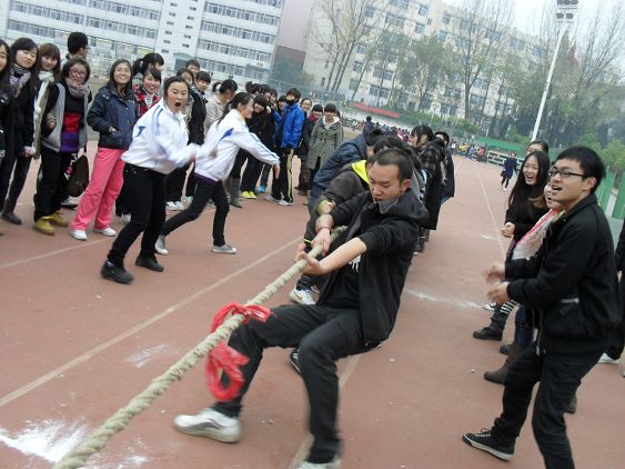 经系员工会体育部的尽心组织,为本次阳光体育活动安排了班级拔河赛、三人两足跑、两人背靠背夹球跑、踢毽子、滚铁环等体育性、娱乐性极强的活动,所有的项目虽都去除了名次的竞争性,但同学们参与的热情使运动场充满了生机、活力,同学们充分享受着运动的快乐。特别是班级拔河赛,使劲的拔、使劲的加油,把活动推向了高潮。