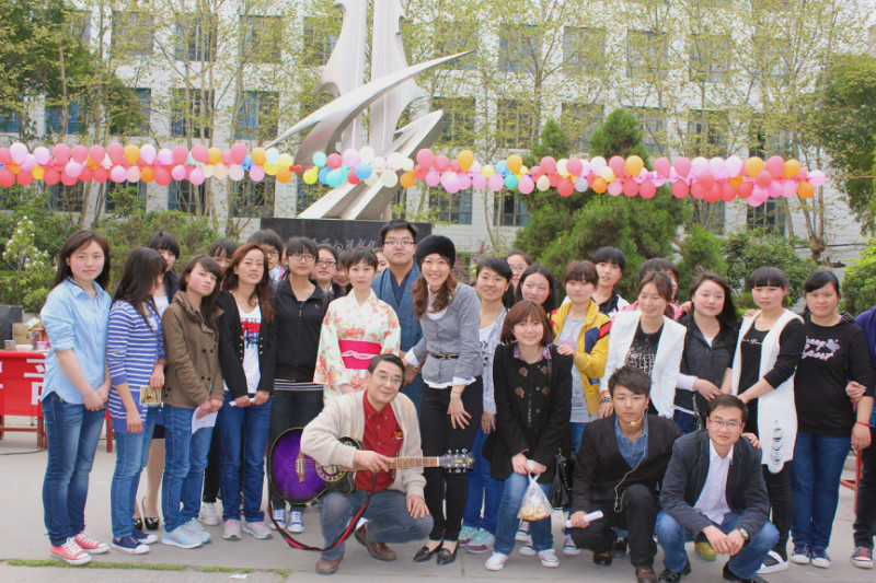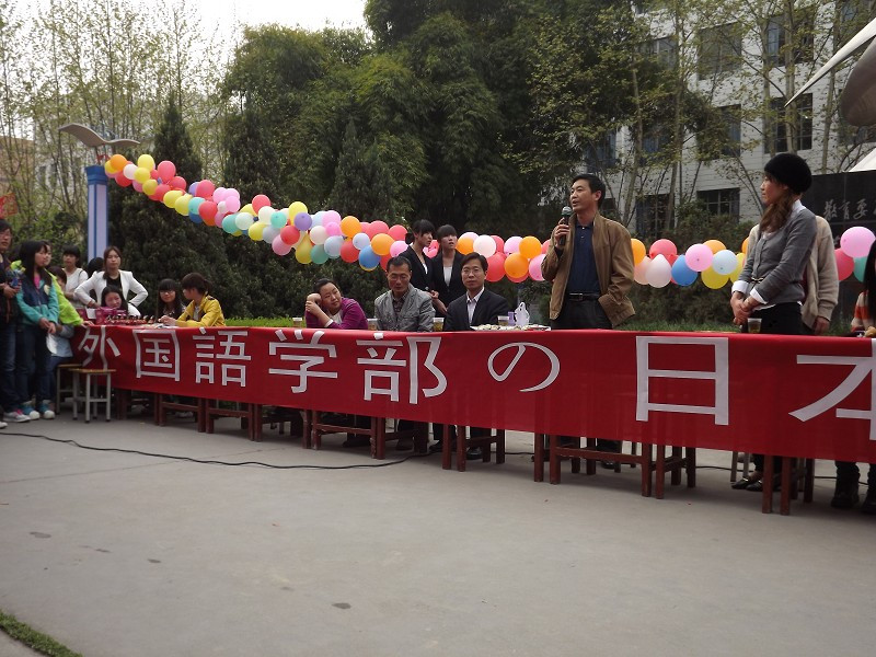 29日下午,文化广场上悬挂着日本式的寿司灯笼,展示了日本传统的竹马,竹筒喷水,人偶等道具,并有身着和服的员工模特,吸引了大批员工和老师前来观看。下午四点半文化广场活动正式开始,李延福书记做了开场发言,鼓励今后多开展这样的活动,增加员工对日本及日本文化的体验和了解。之后日籍教师赤松秀夫和海道千春演唱了《ドラえもん》等日文歌曲,日语专业员工合唱日文歌,然后进行了抢凳子、两人三足吃寿司、踩报纸答题等趣味性的活动。参与活动的人员均有日本式的礼物相送。与此同时,活动现场的嘉宾和观众喝日本式的汤「豚汁(とんじる)」,吃寿司,体验了日本的饮食文化。