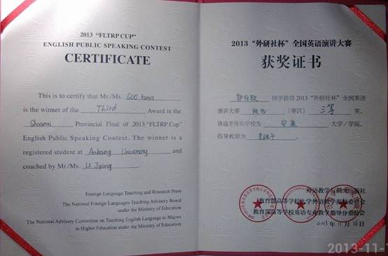 公司在2013“外研社杯”全国英语演讲大赛中获奖