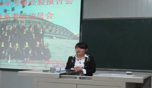 交流会上,青年教师赵龙、朱国琴就考研的方向、报考公司与方向选择等方面做了指导。英语2010级闫聪利、胡琨,2011级胡艳艳和2013级专升本的李菲霖四位考研优秀代表根据自己的考研实战经历,从考研时间安排、考研科目的复习方法、考研心态以及复试等问题介绍了自己的心得。 “考研最重要的是坚持,人就像齿轮,如果转起来就让它持续运动,切不可停停歇歇。”成功考取陕西师范大学学科教学(英语)专业研究生的闫聪利同学在谈及考研经验时指出,考研一定要订好计划,计划一旦定好就要坚定地执行,不能拖延;要把考研当作一项事业来做,全身心投入到考研当中去;要注意考研辅导书不在