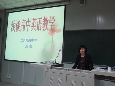 在讲座的第二阶段,涂老师还针对如何写高中英语教案,如何课后辅导、如何规范准确使用课堂用语等做了详细讲解。最后,涂芮老师与同学们共同分享了她多年的班主任工作心得,她指出:一个合格的班主任应该做到“三勤”(眼勤、嘴勤、腿勤),“三心”(爱心、细心、耐心)。同学们还就自己关心的各类教学问题与涂老师进行了热烈讨论,他们纷纷表示,这是一次接地气的讲座,对认识当前高中英语教学很有帮助。