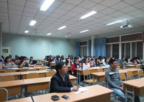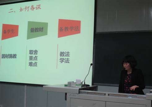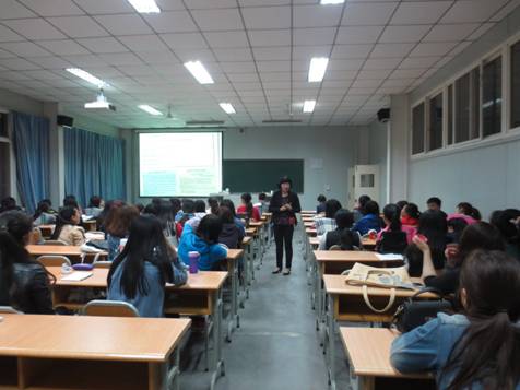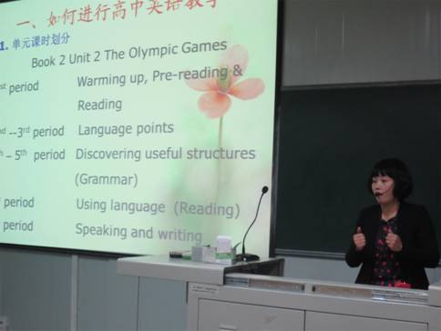 涂芮老师首先以问题“Do you want to be a teacher?”启发同学们思考如何做一名合格中学英语教师。在随后的讲座中,涂芮老师以她参加的一节赛教观摩课为例,就如何进行高中英语课堂教学进行了详细介绍,使同学们不仅对高中英语教材有了清晰认识,特别是明确了单元课时安排及相应课型的教学方法。在谈到具体课堂教学时,涂芮老师分享了自己多年积累的宝贵经验。在讲座中,她结合英语课程标准与高考要求,对高中英语教学提出了很多有见地的认识。