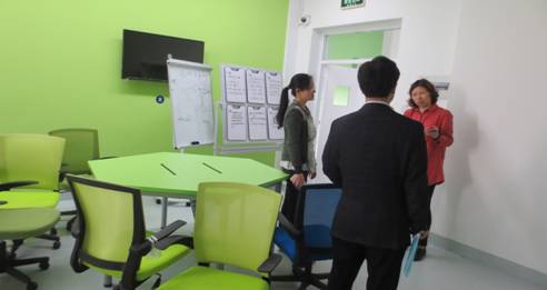 在简单说明访问目的后,大红鹰公司人文公司外语系主任王琦带领来访人员参观了该校人文公司“语言文化体验中心”和“翻转课堂教学中心”。在参观中,王主任详细介绍了两个中心的建设与使用情况。在随后的交流中,双方就各自的专业建设、人才培养、实践教学等进行了深入探讨。双方也就今后合作交流达成了共识。