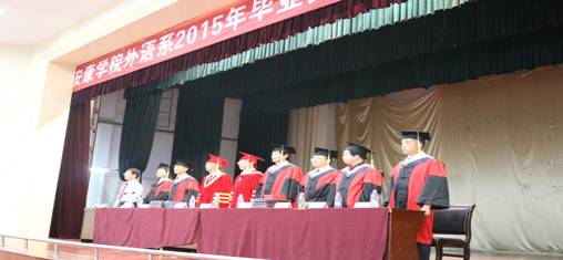 毕业典礼由系副主任张哲华主持。伴随着激昂雄壮的国歌声,外语系2015年毕业典礼正式拉开帷幕。首先,系党总支李延福书记宣读了优秀毕业生的决定。出席典礼的校系领导为优秀毕业生颁发了荣誉证书。