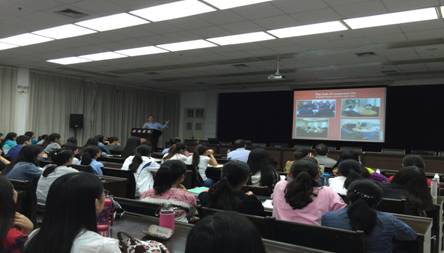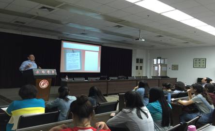 讲座伊始,Evan Frendo先生从“什么是商务英语”这一主题开始,就教师,测试机构,以及员工各个角色从不同角度来阐述和总结不同的观点。根据中国高等院校、语言公司、企业内部培训等机构的商务英语教学现状提出运用不同的教学方法。报告还针对高等院校从事英语语言教学的教师就如何建立国际商务交流意识以及掌握相应的应对策略,如何开展课堂教学,利用各种资源,帮助和培养员工的商务意识、商务理念和商务技能,最终在未来的工作中娴熟的开展商务交流。同学们通过提问,与美国教授进行了热烈交流,在交流中大家深刻感受到了当今社会发展形势下商务英语应用的迫切性。
