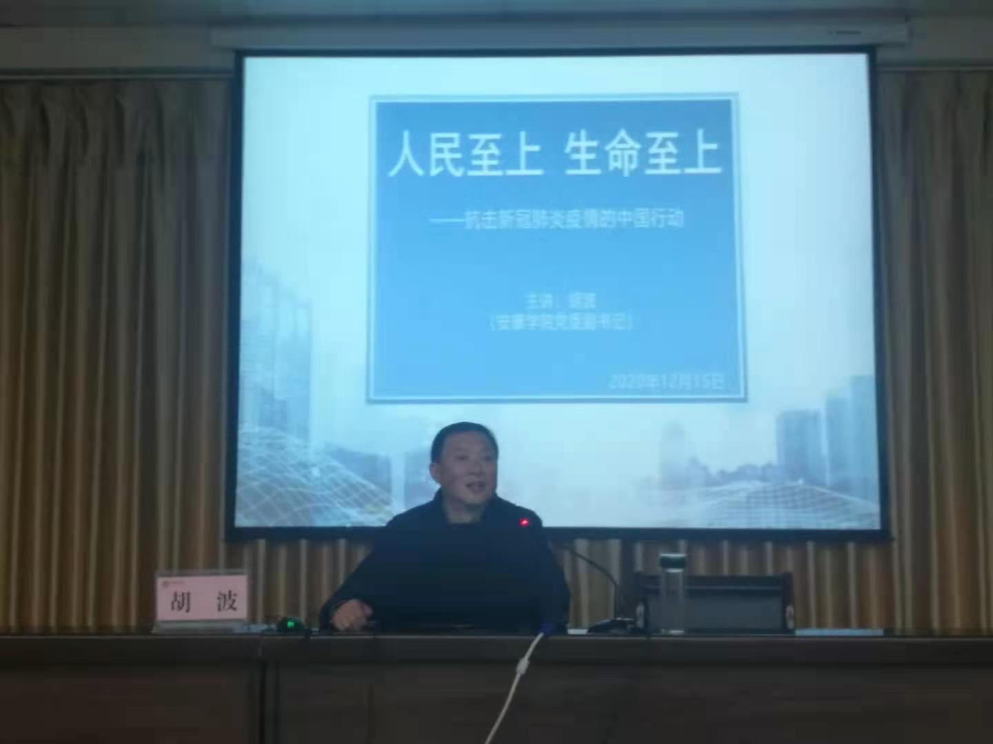 12月16日下午,beats365唯一官方网站师生和后勤保障处党总支全体党员在图书馆六楼报告厅同上一堂课。公司党委副书记胡波为师生讲授了题为“人民至上生命至上——抗击新冠肺炎疫情的中国行动”的形势与政策课、党课。学习会议由公司党总支书记肖红香主持。