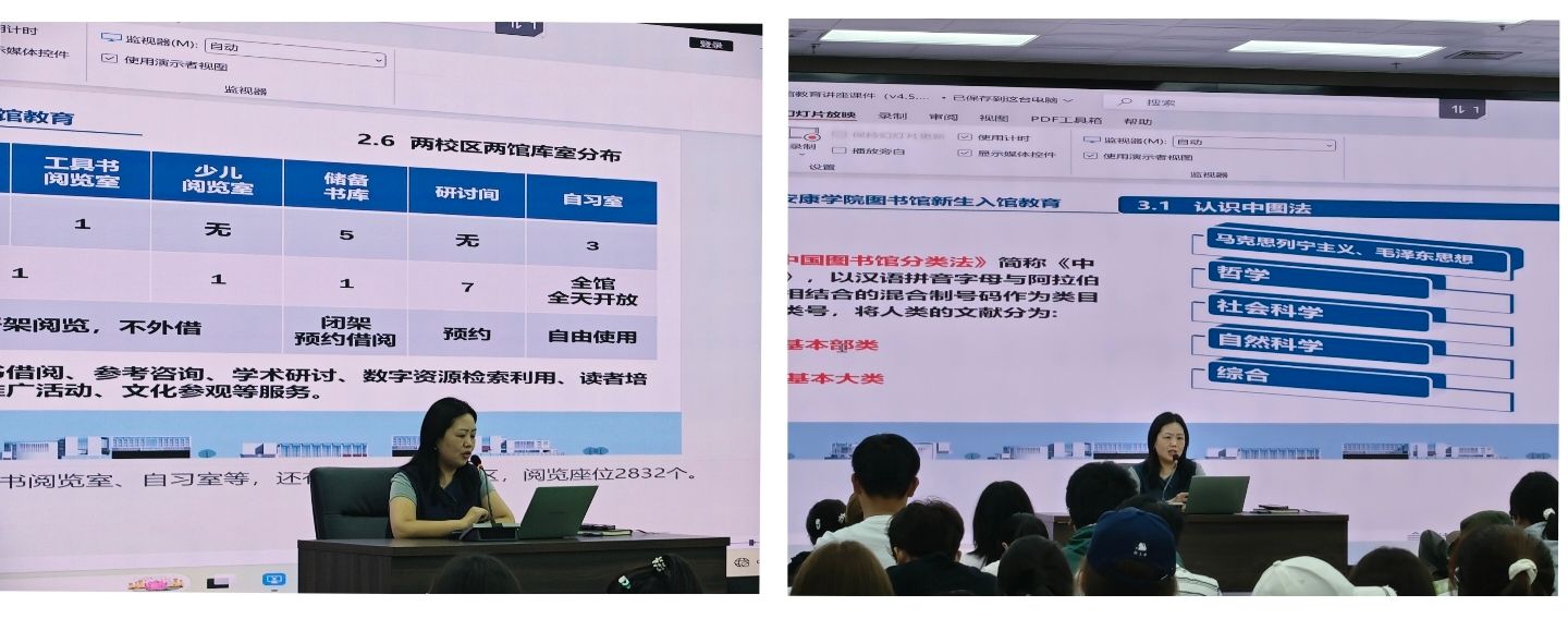 本次入馆教育以“理论讲解+实地实操”相结合的形式展开。周静围绕馆藏布局、文献分类体系、借阅规则等基础内容进行细致讲解,针对新生常见的借阅权限、续借流程、逾期处理等问题进行了集中答疑。