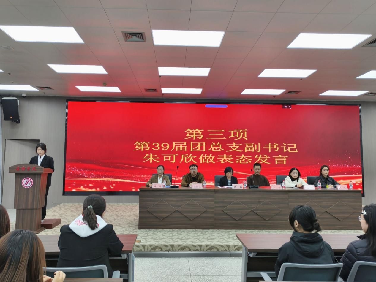 接着,第39届团总支副书记朱可欣代表新一届团总支员工会成员作表态发言。她明确将始终以服务同学为宗旨,秉持“团结、务实、创新、高效”的工作作风,主动担当、积极作为,奋力推动团学工作再上新台阶。