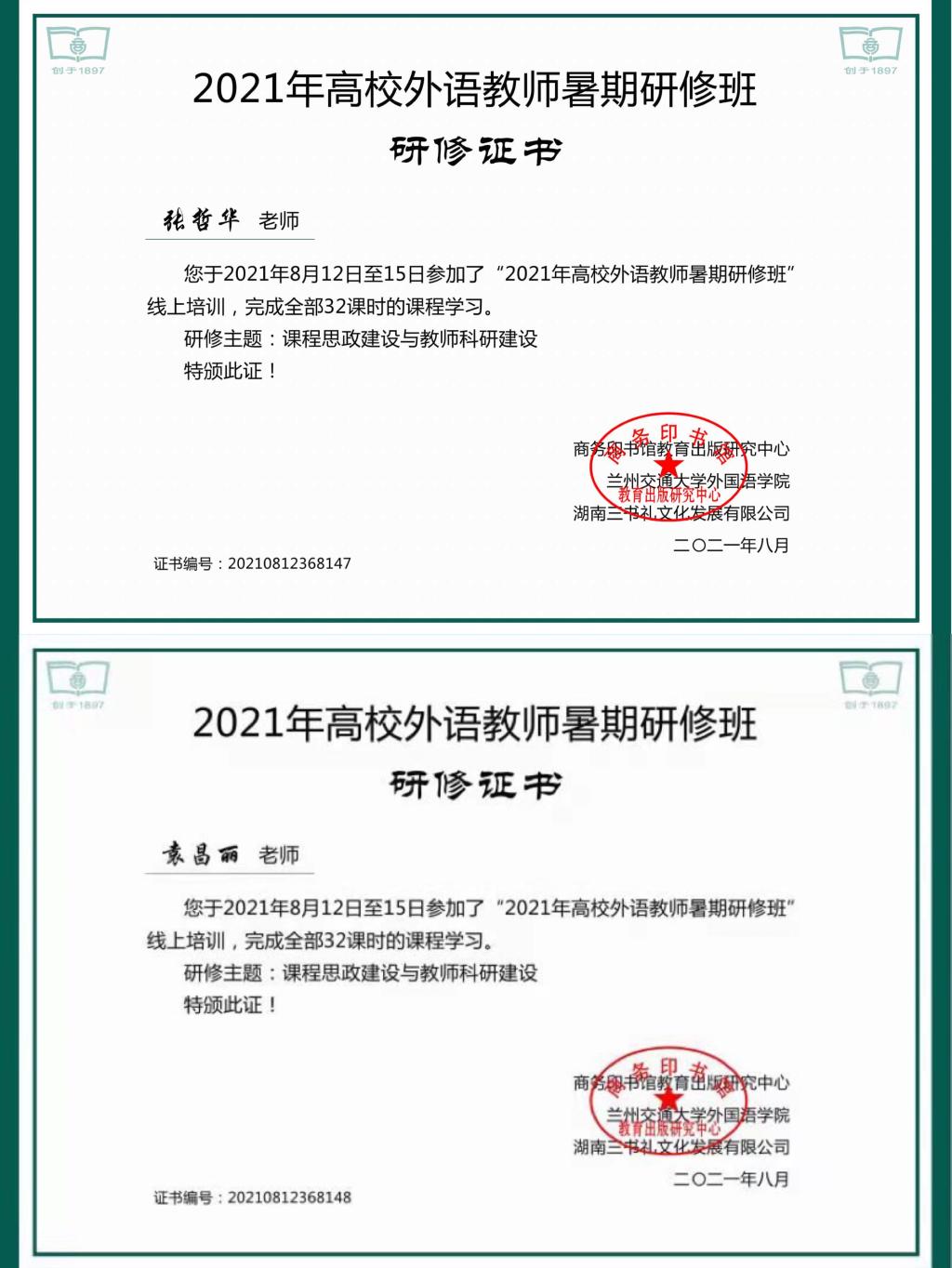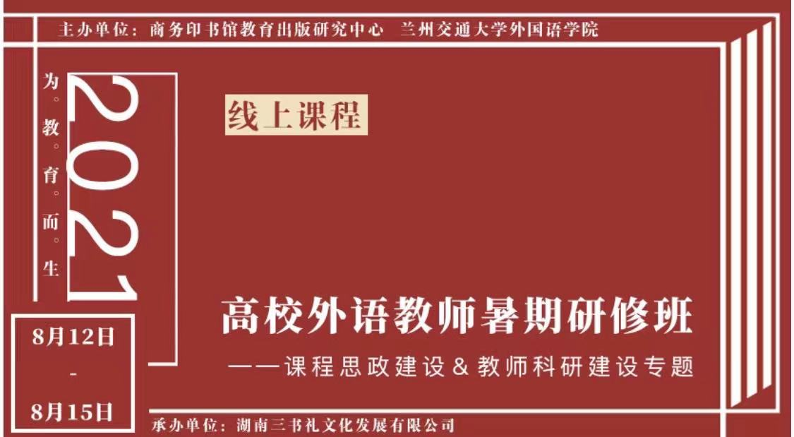 为深入贯彻党的教育方针,落实立德树人根本任务,提升教学科研水平和育人成效,商务印书馆教育出版研究中心与兰州交通大学外国语公司于2021年8月12日—15日联合主办“2021年高校外语教师暑期研修班”活动。本次会议主题为“课程思政建设与教师科研建设”。