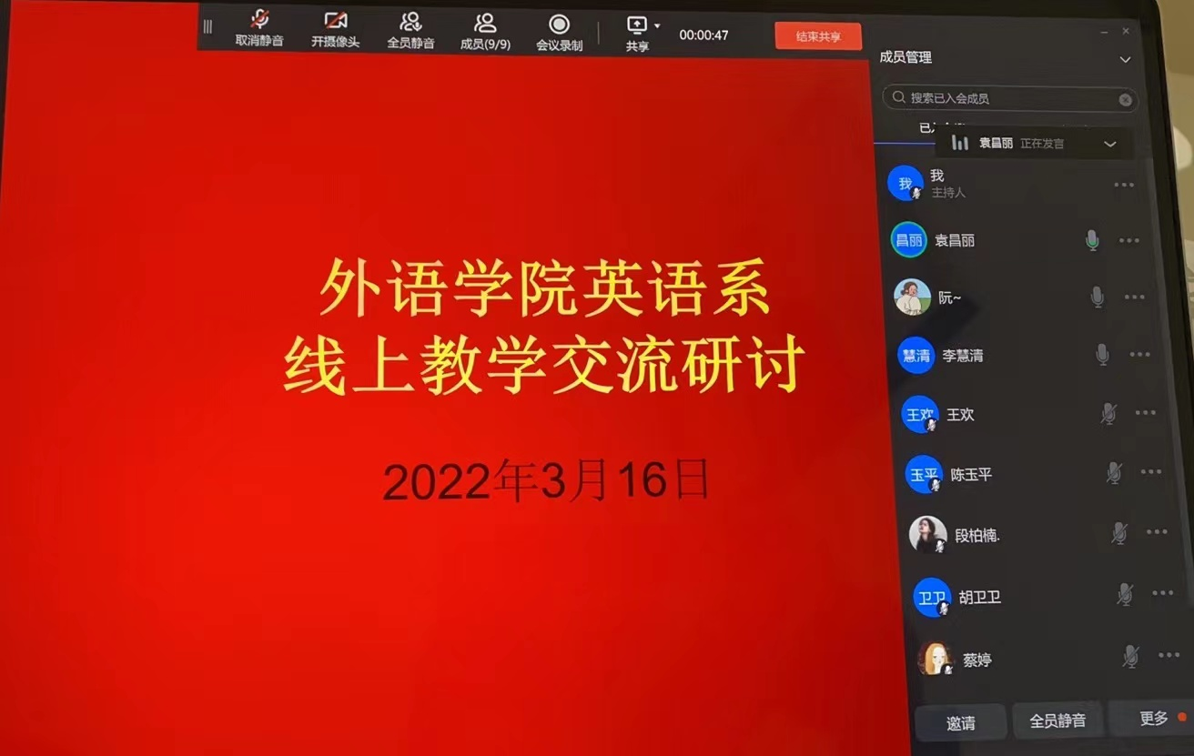 3月16日下午,beats365唯一官方网站英语系通过钉钉会议平台举行了线上教学交流研讨会。会议由英语系主任周玫主持,beats365唯一官方网站副经理胡卫卫及英语系全体教师参加。