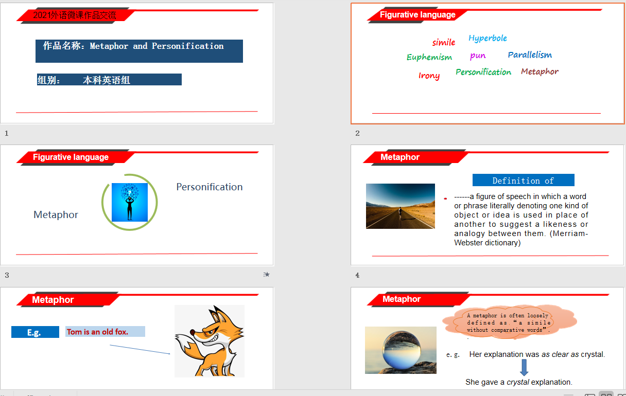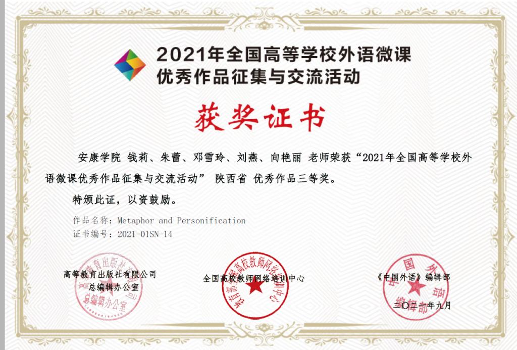 近日,由高教出版社、全国高校教师网络培训中心举办的“2021年外语微课优秀作品征集与交流活动”历经3个月的作品征集、专家评审及公示,公布了优秀作品名单,公司beats365唯一官方网站大学英语教学团队(成员:钱莉、朱蕾、邓雪玲、刘燕、向艳丽)提交的微课作品(Metaphor and Personification)荣获陕西省优秀作品三等奖。