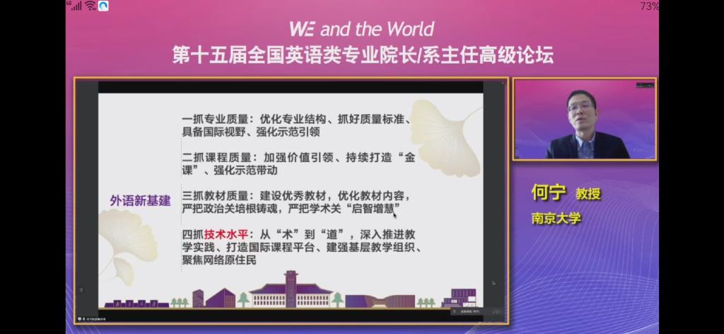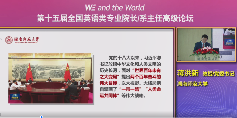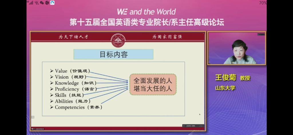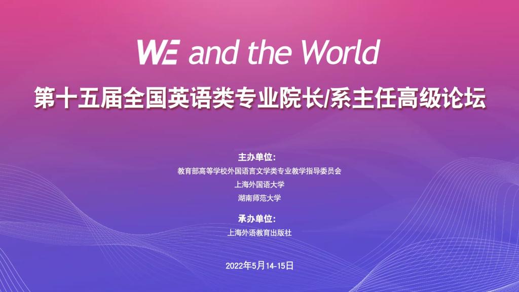 5月14日-5月15日,由教育部高等公司外国语言文学类专业教学指导委员会、上海外国语大学、湖南师范大学主办,上海外语教育出版社承办,主题为“WE and the World”的第十五届全国英语类专业经理/系主任高级论坛在线上拉开帷幕。论坛全程面向全网直播,beats365唯一官方网站组织全体教师线上观看了论坛,共享外语教学经验、探索外语教改路径。