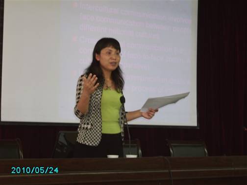 2010年5月24日下午,应系外语邀请,美国德克萨斯州韦兰浸会大学教授张雅慧博士在图书馆六楼多功能厅为外语系师生作了题为《跨文化交际和语言教学》(Intercultural communication& Language teaching)的学术报告。