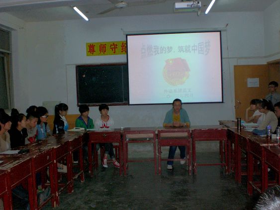 为深入学习贯彻党的十八大精神,全面理解“中国梦”的内涵,引导广老员工为实现国家富强、民族复兴而发奋学习、不懈努力。4月24日晚,外语系团总支组织召开“点燃我的梦,铸就中国梦”主题团日座谈会。系党总支书记李延福、团总支书记周静、辅导员杨厚东以及各班团干部等50余人参加了座谈会,座谈会由周静主持。