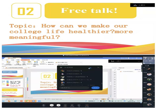 活动首先以3个励志的短视频奠定基调;在视频播放完毕后,主持人提出了与同员工活息息相关的问题,探讨对于为期两周网课的看法,如何在疫情期间在保持健康的学习与生活习惯,提高学习效率等。整个过程,主持人与同学们积极互动且配合默契,表现出很高的热情与参与积极性。
