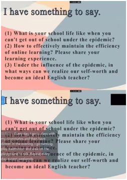 最后,伴随着热烈视频连线、留言讨论,大家沉浸在轻松、和谐的英语交流氛围中,本期英语角活动也圆满结束。许多同学表示,这次的英语角活动给了一个表达自己、锻炼自己、突破自己的机会。在活动中不仅提升了自己的口语表达能力,收获了多种方式的学习模式、方法,进一步明确了对于师范生与教师身份的认识,思考了如何实现自我价值成为优秀英语教师的方向,探索新时代教育途径,打好专业基本功,落实基础教育根本任务。我们也许会因为疫情感到踌躇,但不会停下生活的脚步,因为时间从来不会为我们的人生按下暂停键。即使身在疫情中,也依旧要努力前进,在学习中不断探索,提升自我,实现价值。