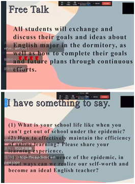 在Free talk环节,大家的热情丝毫不减,同学们分别以个人和宿舍为单位畅所欲言、各抒己见分享对英语师范生和英语教师身份的认识,表达了对实现自我价值成为一名有理想的英语教师的热情,以及为成为有理想信念的优秀英语教师的规划。
