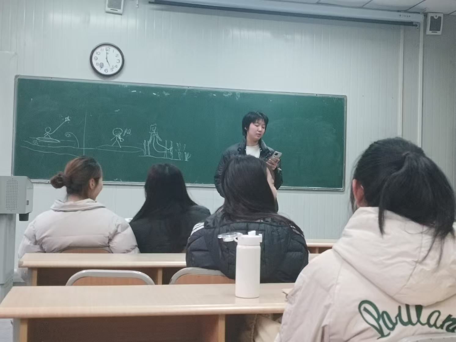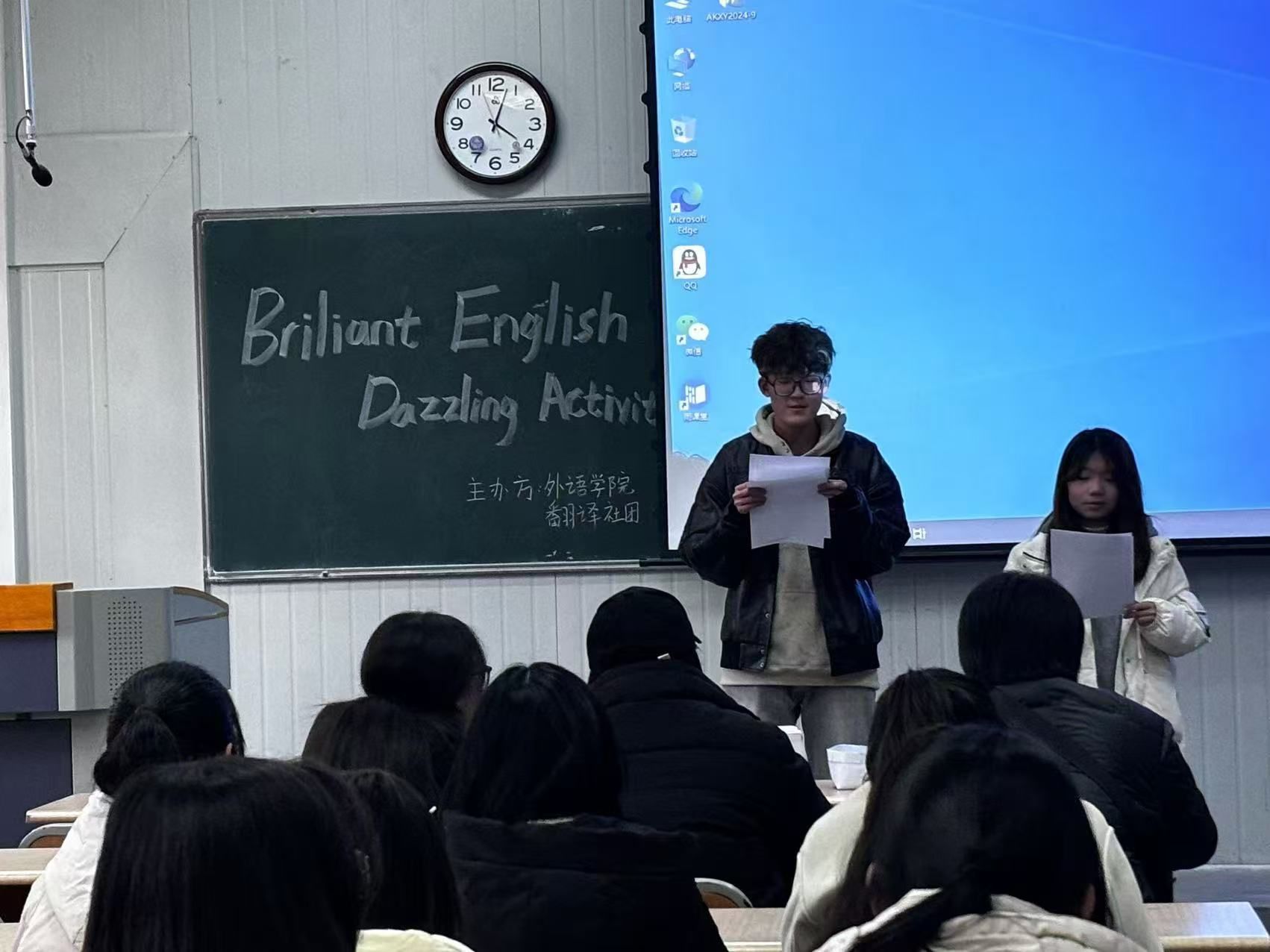 活动的第二个阶段是创意翻译涂鸦秀。同学们通过抽象画作和幽默的英语描述展示了各自的创意,寓教于乐的方式不仅让大家收获了乐趣和知识,还进一步增强了同学们的英语运用能力和创新能力;最后,经典英语歌曲赏析会将活动推向高潮,两位同学上台演唱,表演者用婉转的旋律和动听的歌声演绎了经典英文歌曲,展现了他们的音乐才华和英语发音技巧,让同学们在英语歌曲的旋律中感受到了英语文化的魅力。