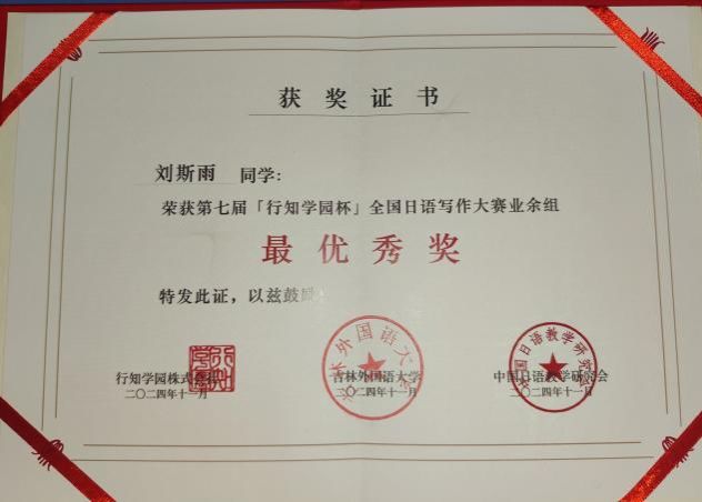 近日,第七届“行知学园杯”全国日语写作大赛成绩揭晓。公司员工刘斯雨从全国一百余所高校的1340名参赛选手中脱颖而出,获得业余组“最优秀奖”,陈玉平老师获得“优秀指导教师”荣誉称号。