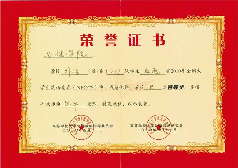 在5月9日举行的2010年全国老员工英语竞赛决赛中,公司英语专业2007级的赵聪同学荣获B类特等奖,园林技术2009级的杨倩倩同学获得D类(高职高专非英语专业)一等奖,外语系(大学英语教学部)陈平、周玫老师荣获优秀指导教师奖。由全国高等公司大学外语教学指导委员会和高等公司大学外语教学研究会联合颁发获奖证书。另有9名同学获得二等奖,20名同学获得三等奖(名单见附表)。