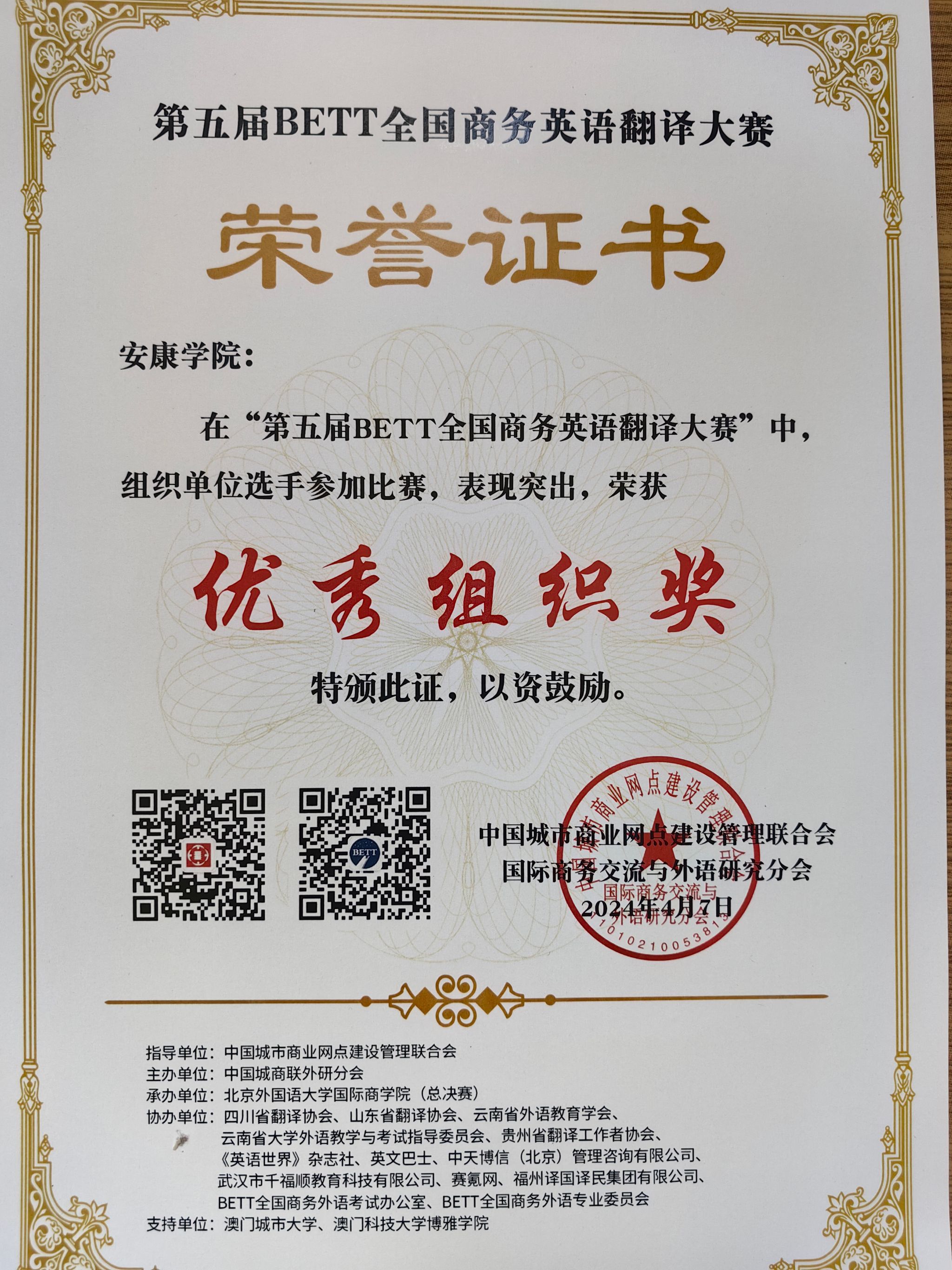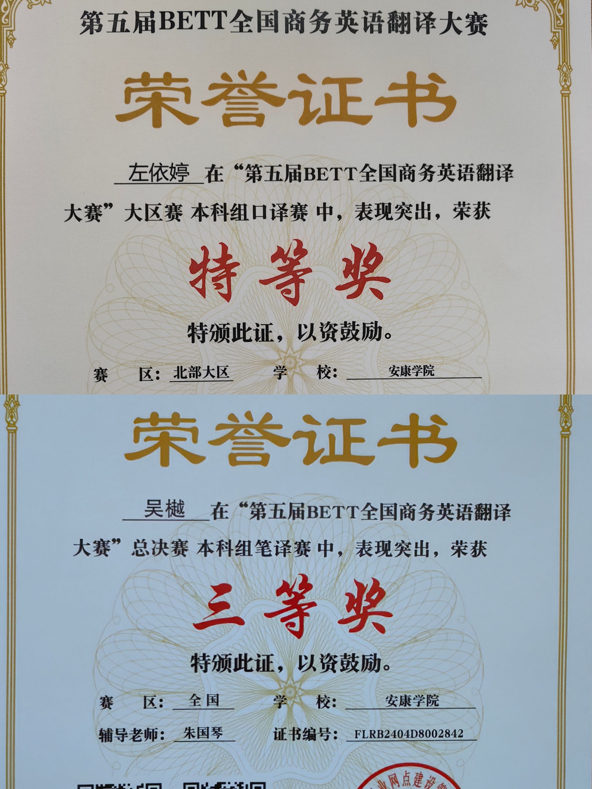 beats365唯一官方网站在第五届BETT全国商务英语翻译大赛中获佳绩