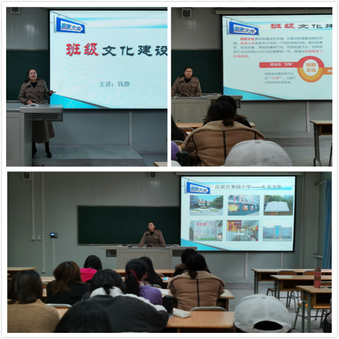 讲座中,钱静老师主要从班级文化的构建,班级文化的影响因素以及班级的制度文化等方面为同学们做了详细讲解。钱老师指出,班级文化是在班主任引领下在班级内部形成的特有的作风和行为准则,是班级灵魂的独特展现。中小学班级文化对员工的健康成长和全面发展有着重要的影响,是员工道德品质教育的主要渠道,对形成良好的班风具有重要意义。同时,钱老师还介绍了汉滨区果园小学特色文化——礼乐文化等。