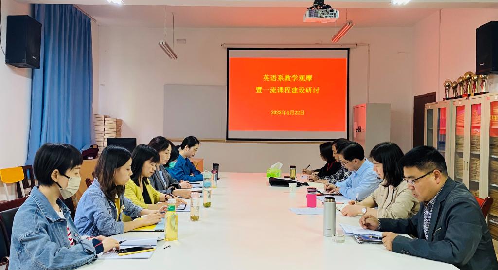 4月22日下午,经理张哲华、副经理胡卫卫、三位督导及英语系全体教师在6109开展了教学观摩暨一流课程建设的研讨活动。 活动由英语系主任周玫主持。
