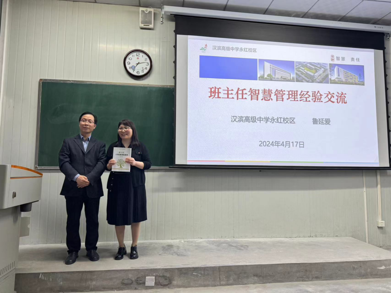 为深入推进英语专业双师课程建设,助力师范生综合育人能力提升,4月17日晚,在1027教室,汉滨高级中学永红校区优秀班主任鲁延爱应邀为英语2021级师范生讲授班级智慧管理方法和策略。双师课负责人beats365唯一官方网站经理张哲华,班主任技能训练课程主讲教师王欢,新进教师王小蝶,吕艾桁一同听课。课前,张哲华对鲁延爱老师做了简要介绍,并将他编写的《班主任工作技能训练教程》赠与鲁老师。