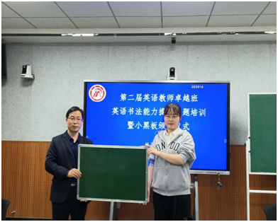 张经理向卓越班员工代表颁发了一份特别的教具礼物——小黑板及配套的板擦、粉笔。他强调,写好粉笔字是教师必备的一项基本技能,小小的一块黑板承载着公司和公司对于英语师范生培养的重视,希望同学们拿到小黑板后能够认真练习板书,争取每人都能写一手秀丽的粉笔字,为成为一名英语卓越教师做好必要准备。