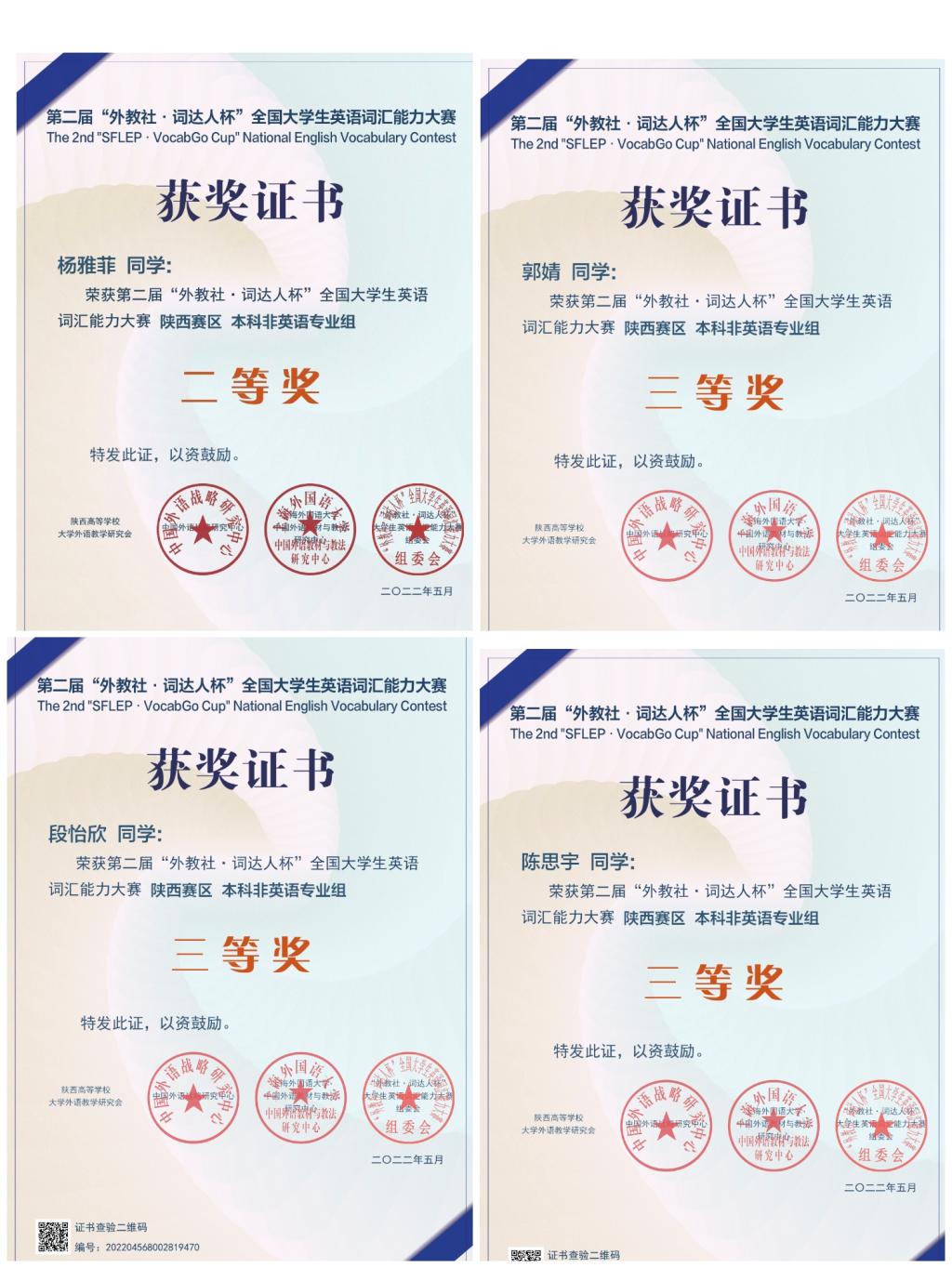 近日,2022年 “外教社·词达人杯”老员工英语词汇大赛陕西省赛成绩揭晓。公司旅环公司杨雅菲、数统公司翟甜怡等2名同学获得非英语专业组省赛二等奖,经管公司郑欢欢等6名同学获得非英语专业组省赛三等奖;beats365唯一官方网站卢佳敏同学获得英语专业组省赛三等奖。