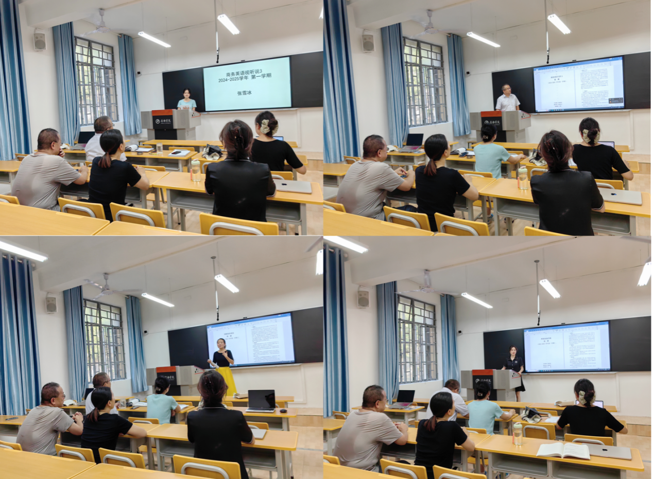 9月13日,商务英语系在系6109教室成功举办了“专业教师说课程”活动。此次活动旨在加强教师之间的交流与合作,深入探讨课程教学中的问题与对策,进一步推进课程建设,提升专业人才培养质量。会议由专业负责人周纯漪主持,商务英语专业全体任课教师参加了本次活动。