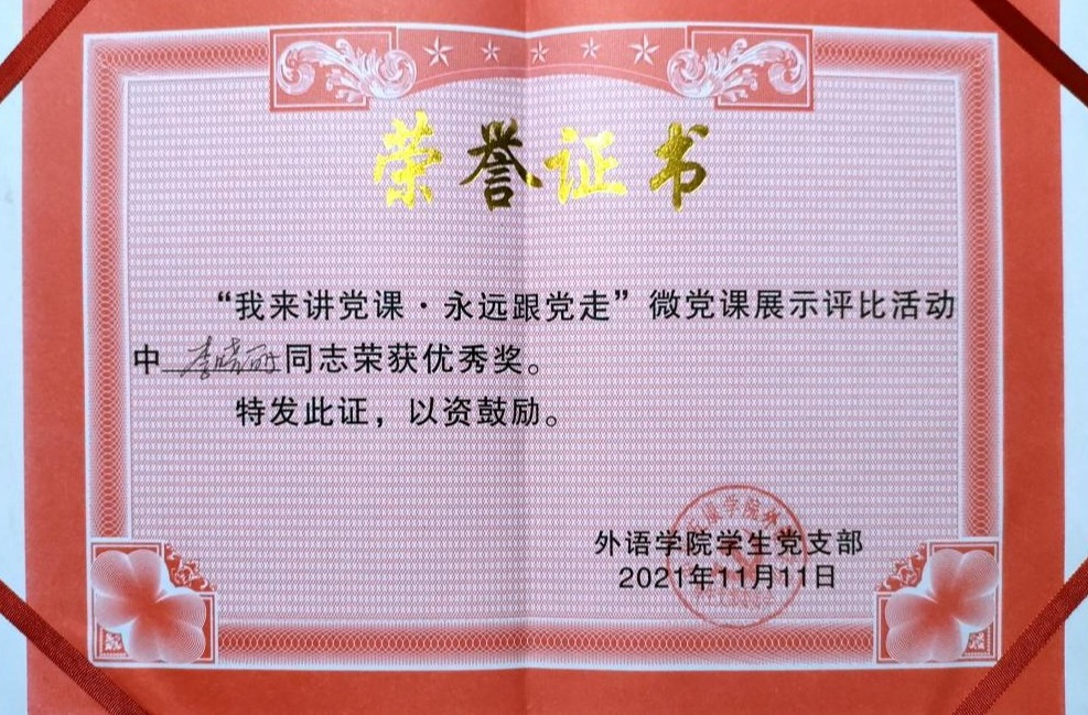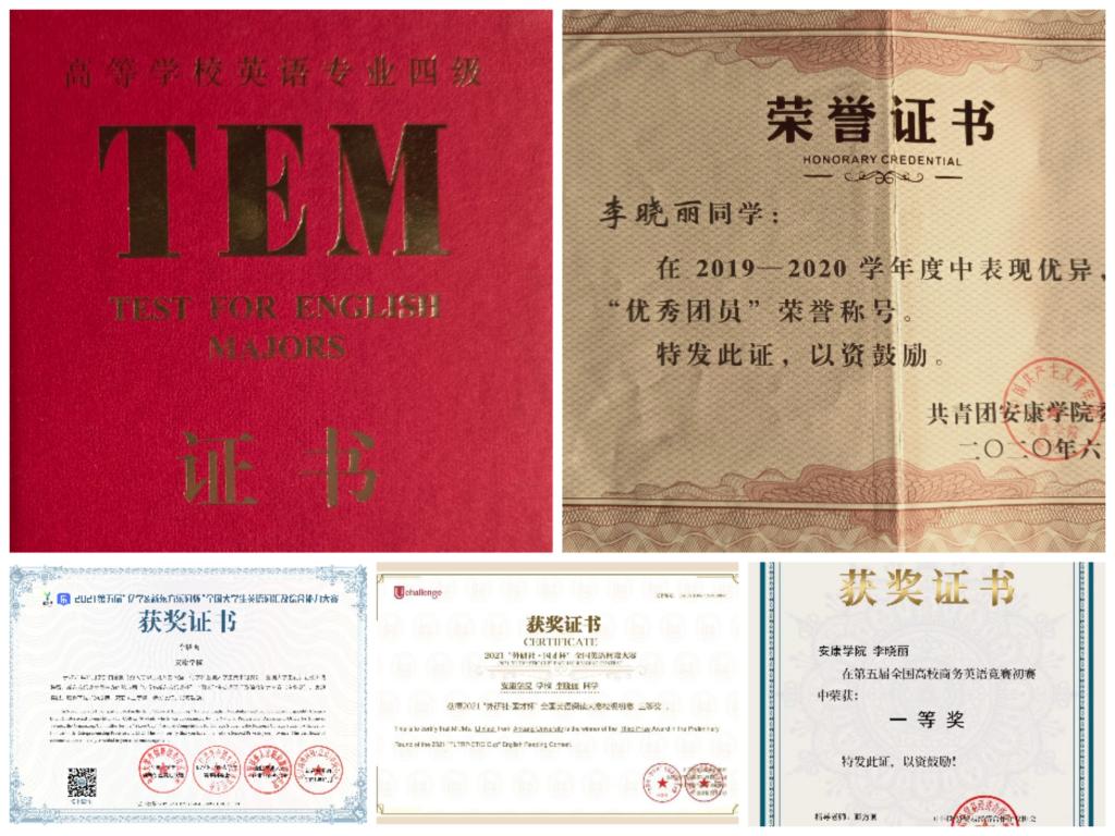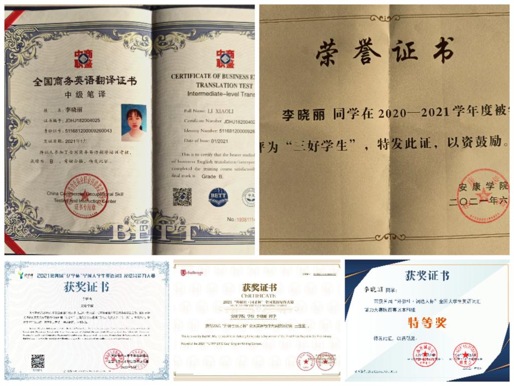 李晓丽,女,中共预备党员,beats365唯一官方网站2019级商务英语专业1班员工。“不忘初心,砥砺前行”,她连续两学年学业成绩和素质综合成绩均名列专业第一,获2019-2020学年国家励志奖学金、2019-2020学年BEAT365英国官网网站优秀团员、2020-2021学年BEAT365英国官网网站三好员工。获首届“外教社词达人杯”陕西赛区特等奖、第五届全国高校商务英语竞赛初赛一等奖、第四届“亿学杯”词汇大赛省二等奖、双百杯扶贫产品创意营销大赛校级初赛三等奖,考取普通话证书、英语四、六级证书、英语专业四级证书、全国商务英语翻译中级笔译证书,获得2020-2021学年国家奖学金。