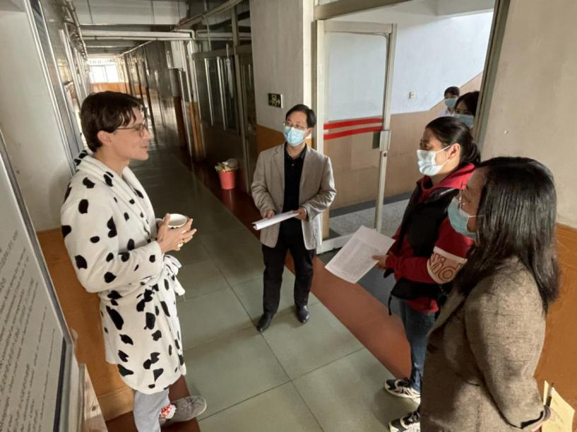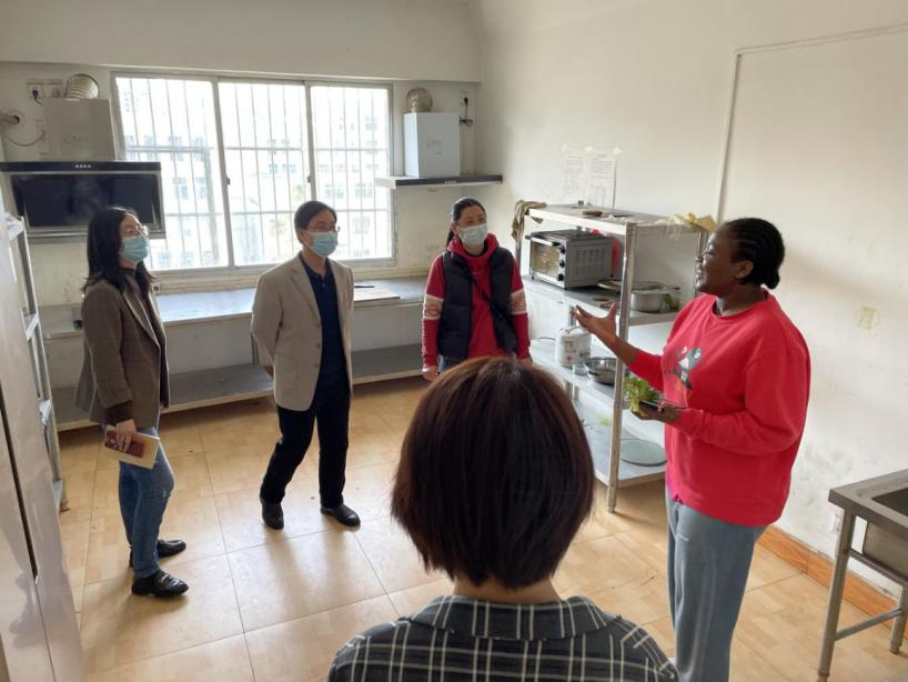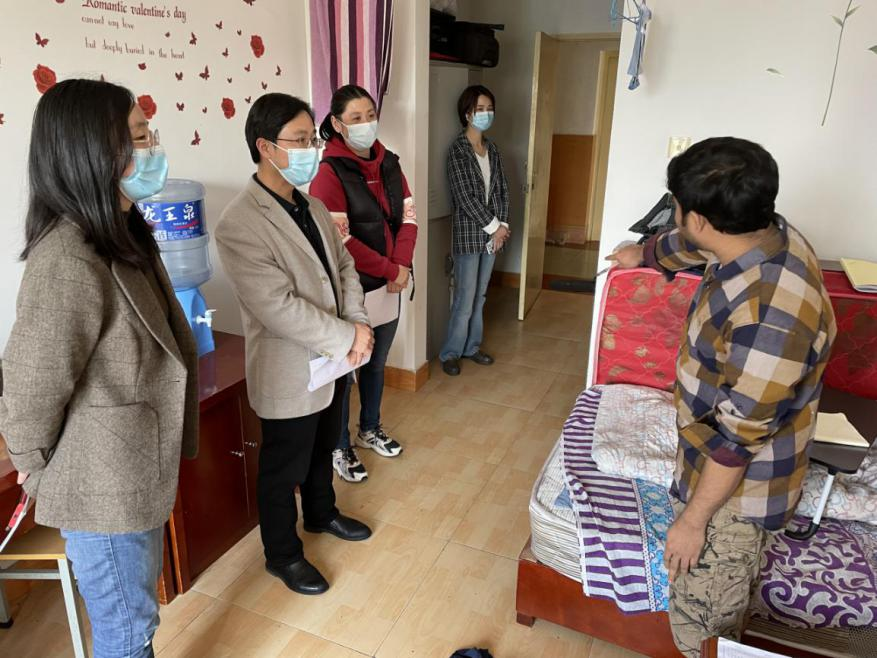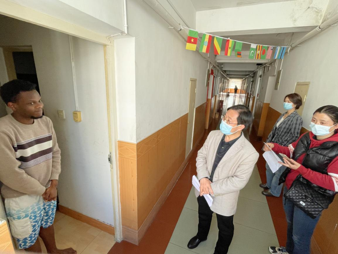 4月2日下午,国际教育公司经理张哲华、副经理肖红香、副经理陈蕾、学工办主任李泊霖、辅导员陆传梓检查职工公寓并看望在校职工。