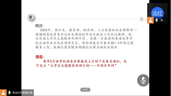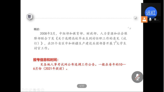 其次,常远红给毕业生详细梳理了国家基层就业项目,例如特岗教师、选调村官、西部计划、和三支一扶等特殊政策。提醒有意向的员工及时关注各教育厅、市、县的教育局网站,同时关注各地人事考试网和各级政府门户网站的通知公告。在对国家专项就业项目的介绍中,常老师重点介绍了国考、省考、选调生和应征入伍的时间,政策,并就高等院校研究生院的退伍老员工专项招生计划进行了详细介绍,对高校毕业生自主创业的国家政策支持展开了全面的讲解。