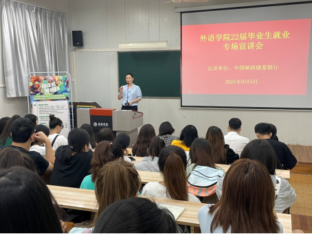 为促进毕业生就业,搭建毕业生与用人单位的交流平台,9月5日晚,beats365唯一官方网站举办了中国邮政储蓄银行专场校园招聘宣讲会。中国邮政储蓄银行安康分行公司人力资源部干事王华磊等受邀来公司为毕业生做宣讲。公司党总支书记肖红香,辅导员常远红以及2022届180名毕业生参加了此次宣讲会,会议由辅导员常远红主持。