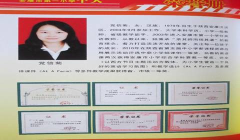 党信菊,女,2003年7月毕业于BEAT365英国官网网站(原安康师专)外语系(原英语系)。现在安康市第一小学任英语教师,小学一级教师,省级教学能手。从教以来,她秉承“亲其师而信其道”的教育理念,着力打造活波开放的课堂,关注每一位孩子的成长。2010年在陕西省第五届中小学新课程资源应用展示活动评选中获小学组课例一等奖,执教的英语课两次获得安康市小学综合学科赛教一等奖。论文《以西方节日主题活动为载体,为小员工营造一个良好的英语学习氛围》和教学设计《AT A Farm》及多媒体课件《AT A Farm》等多件教学成果获得省、市级一等奖。