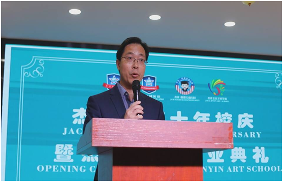 5月15日上午,beats365唯一官方网站副经理(主持工作)张哲华应邀参加beats365唯一官方网站优秀毕业生、青年创业家鲁秀丽创办的杰克英语培训公司十周年校庆及杰克金音艺术培训公司开业典礼,并代表出席嘉宾致辞。