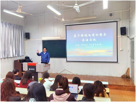 为提高公司商务英语专业员工专业认知,11月24日,中国国际贸易学会全国贸易业务员岗位培训中心副主任、高级经济师王斌应公司邀请,为商务英语专业员工开展了《基于跨境电商的商务英语实战》专题讲座。公司副经理张哲华、胡卫卫、部分商务英语专业教师和商务英语专业三个年级员工聆听了讲座并进行了互动交流。