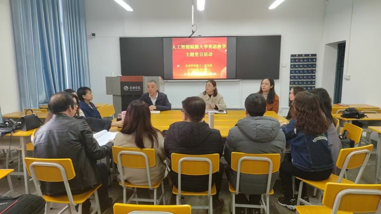 在交流研讨环节,大家围绕如何利用AI工具提升课堂教学效率与个性化水平、党员教师在教育数字化转型中的引领作用以及推进AI教育应用的难点与对策建议等议题展开深入讨论,并结合大学英语教研室实际情况,提出了在课程设计、教师培训、资源建设等方面的创新建议。