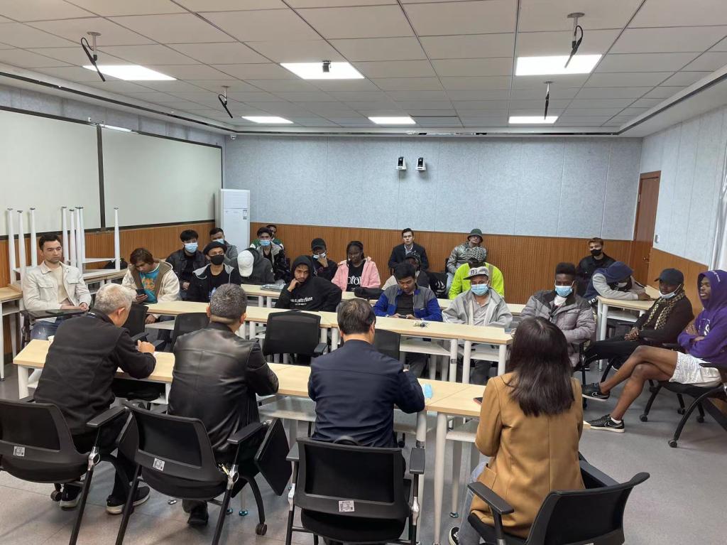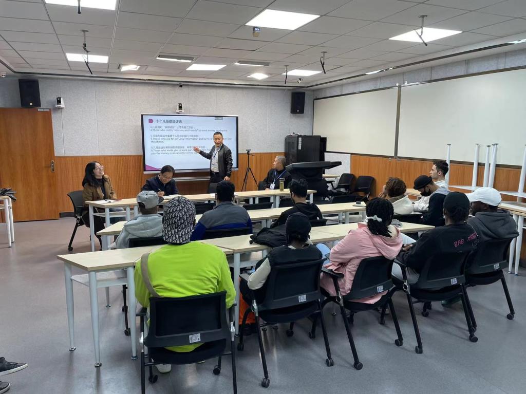 张哲华做总结讲话。他号召全体职工要主动下载国家反诈中心客户端,学习防范、反诈知识,提高防范意识;要主动学习、严格遵守校纪校规、法律法规,遵守疫情防控管理规定;要认真学习领会中华文化,讲好中国故事,做好两国文化交流的使者。