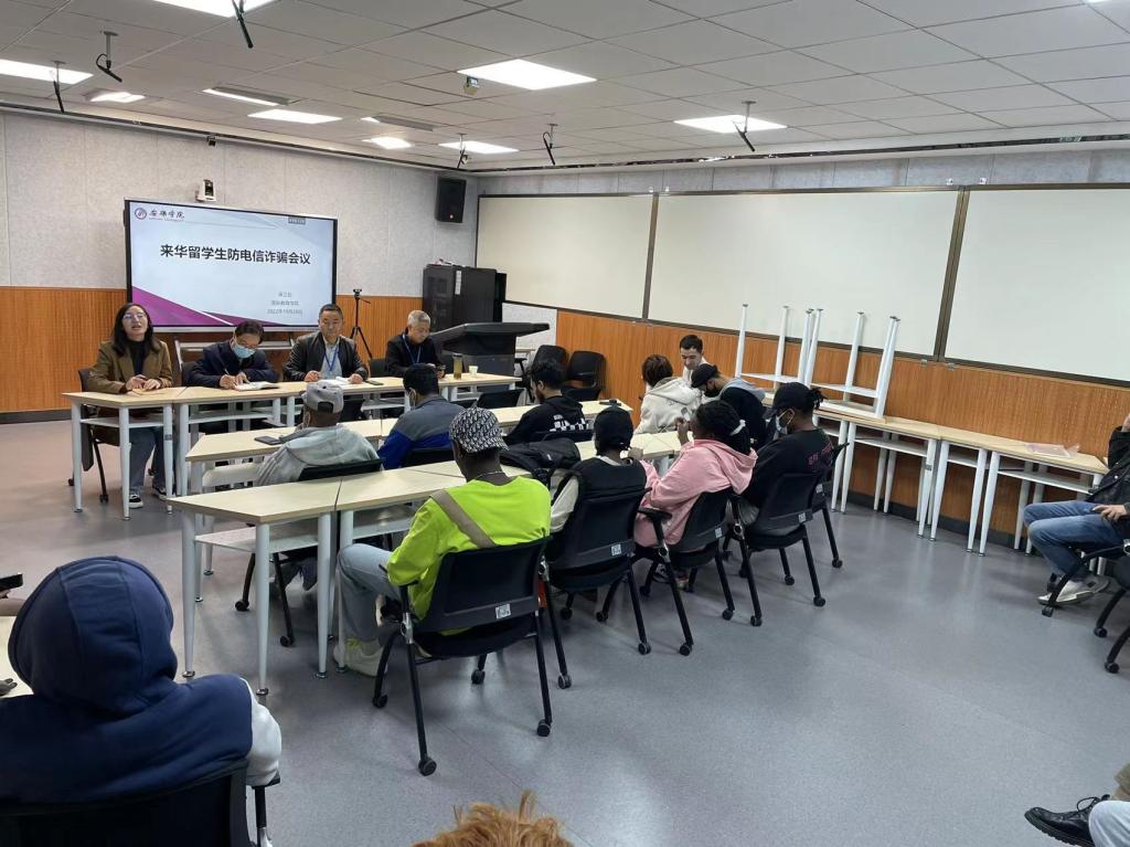 为深入贯彻落实习近平总书记对打击治理电信网络诈骗犯罪工作的指示精神,进一步提升公司职工防范“电信网络诈骗”意识和能力,遏制“电信网络诈骗”案件的发生,2022年10月28日下午,国际教育公司举行来华职工防电信诈骗会议暨安全教育讲座。国际教育公司经理张哲华、副经理陈蕾、辅导员陆传梓及全体职工参加了此次会议。会议特别邀请保卫处处长王开忠、治安科科长王登文做专题讲座。会议由陈蕾主持。