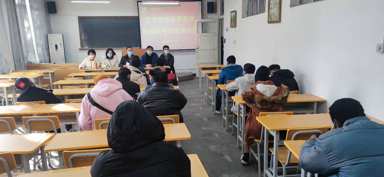 12月21日,国际教育公司召开疫情防控政策宣讲暨期末考试安排会议,副经理陈蕾、学工办主任李泊霖、辅导员李贤松及全体在校职工参加此次会议,会议由陈蕾主持。会议特别邀请公司保卫处处长王开忠和消防科科长杜恒为职工做近期疫情防控政策宣讲,以增强职工们的防疫意识,强化校园疫情防控管理。