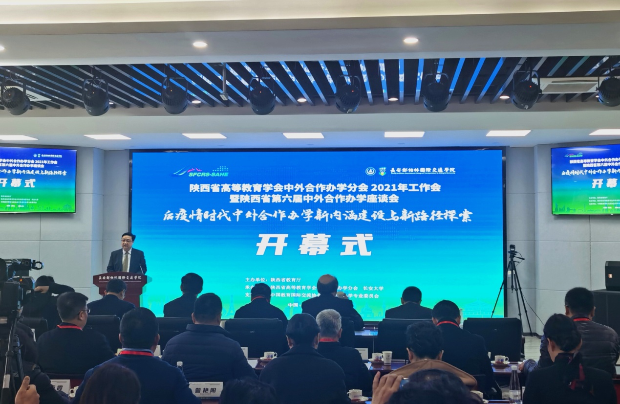 11月29日,由陕西省教育厅主办、陕西省高等教育学会合作办学分会和长安大学共同承办的陕西省高等教育学会中外合作办学分会2021年工作会暨陕西省第六届中外合作办学座谈会在长安大学渭水校区召开。陕西省教育厅副厅长刘宝平,教育部国际司涉外办学与监管处副处长王婧瑶等出席并讲话。来自省内外50余所高校、中外合作办学机构的有关领导及专家共240余人参加了此次大会。会议采取线上线下相结合的方式进行,公司副董事长张东红、国际处副处长陈蕾线下参会,外事及职工管理科科长李泊霖通过线上参加会议。